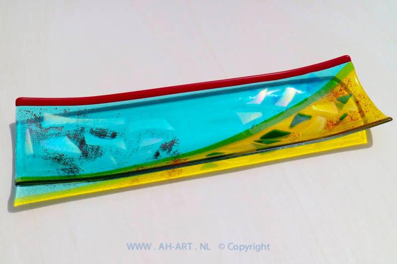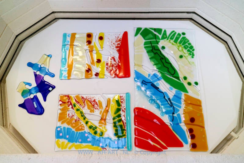 Met stukken gekleurd fusion-glas van Amerikaanse topkwaliteit maak je een glaskunstwerk van je eigen gemaakte ontwerp voor een schaalvorm, een staand model of hangobject van circa 32 x 40 cm. Glasfusion, ook wel gesmolten-glastechniek genoemd - is een techniek die in de glaskunst wordt gebruikt waarbij stukjes of stroken glas van dezelfde of verschillende kleuren samengevoegd worden door ze geheel of gedeeltelijk te versmelten. Glasfusion biedt zo ook de mogelijkheid om de verschillende kleuren van glasdelen met elkaar te laten vervloeien of te vermengen. De verhitting vindt plaats in een elektrische oven op krachtstroom van 380 Volt. Twee of meer stukken gekleurd glas worden op elkaar gelegd of overlappen elkaar en worden verhit tot temperaturen tot circa 800° C. Hierna volgt een lang traject van afkoelen. De oven-computer regelt dat de glasoven op de juiste manier afkoelt. Het hele proces duurt circa 24 uur. Zie onder de foto's en neem een kijkje op de site www.ah-art.nl.